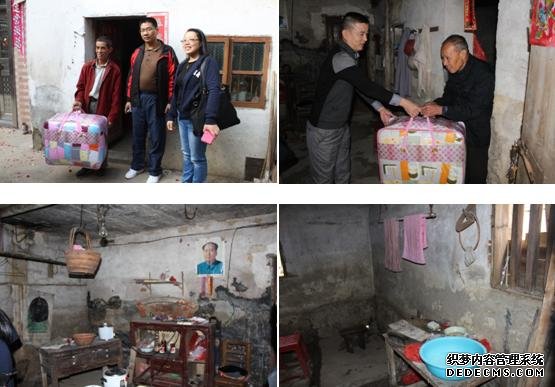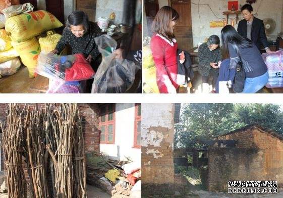 这家里的老婆婆行动不便,而且单目失明,只能忙乎一些简单的家务活,媳妇因精神问题,基本上帮不了忙。环视他们所住的小房屋,只有简单的生活必需品,据说大部分是人们捐赠而来的。老婆婆平日生活简朴,一对破旧穿洞的布鞋、一件棉袄凑合着就过冬了。一家人生活相当拮据,再加上今年的洪水灾害,农田被毁,更是雪上加霜。目睹了如此生活状况,善心的送暖小组工作人员当场解囊,再次为老婆婆捐款。当老人颤抖着双手接过棉被、棉衣和善款时,眼眶湿润,不停地向工作人员道感谢,还蹒跚着坚持把工作人员送出门外,驻目良久才肯归去。